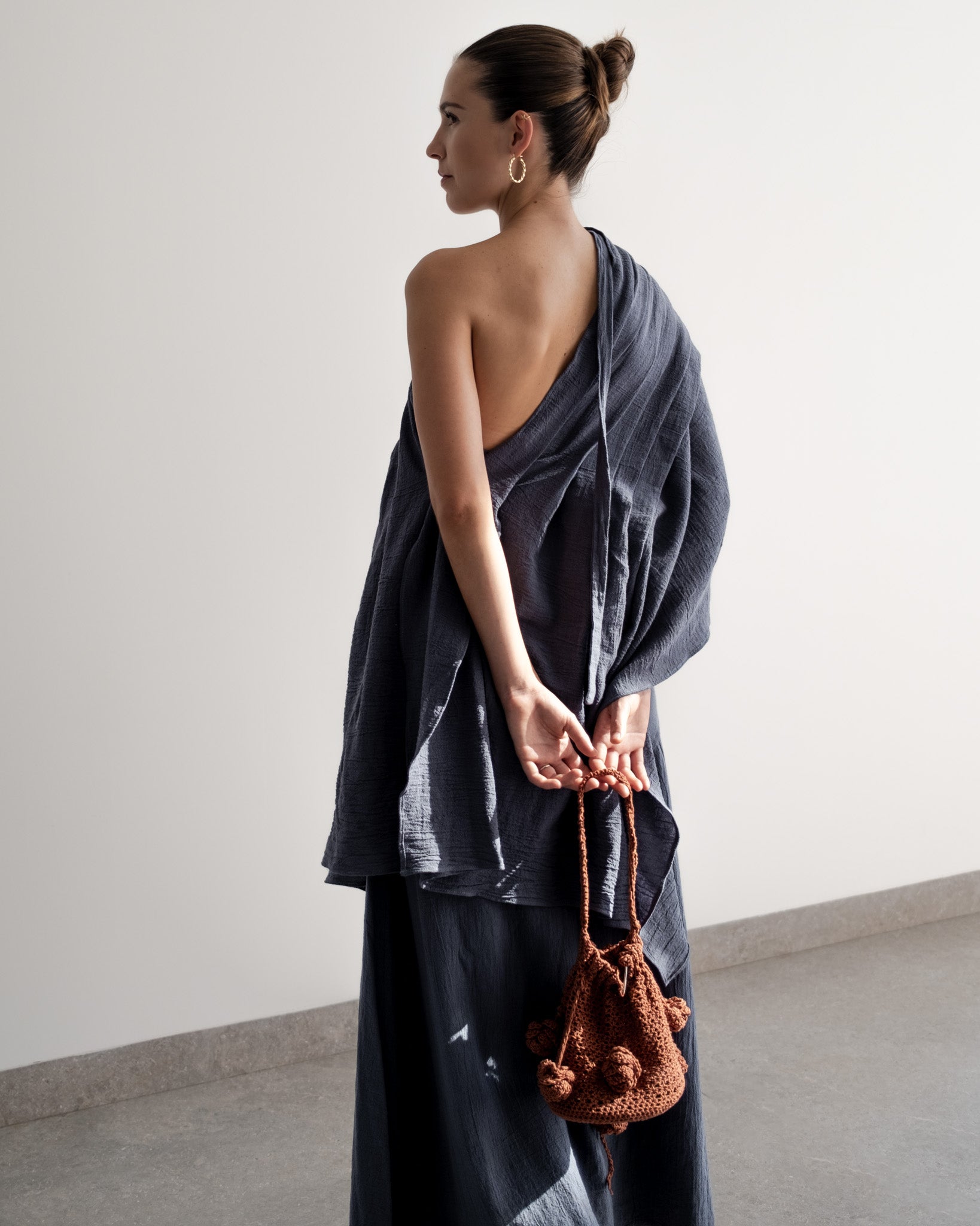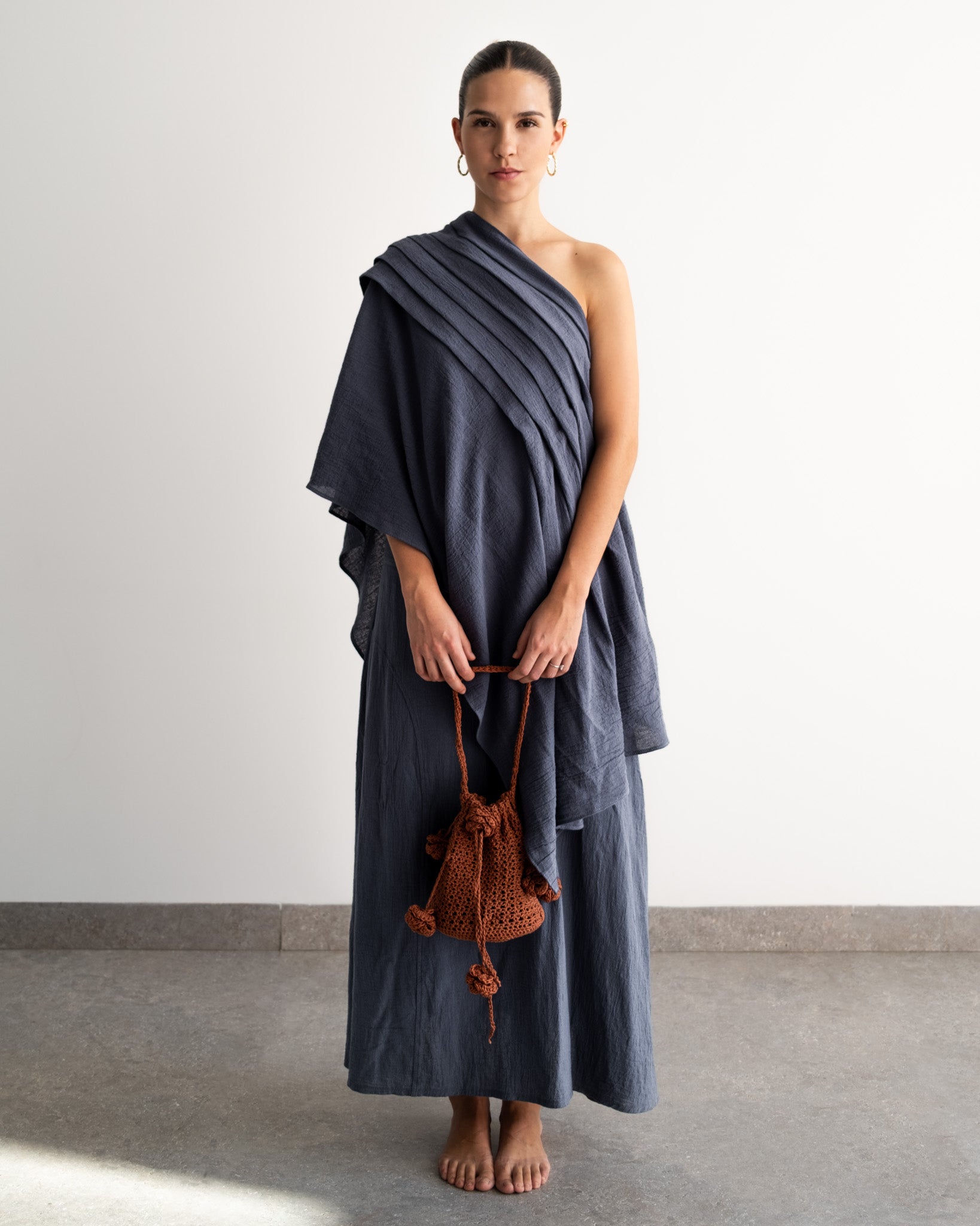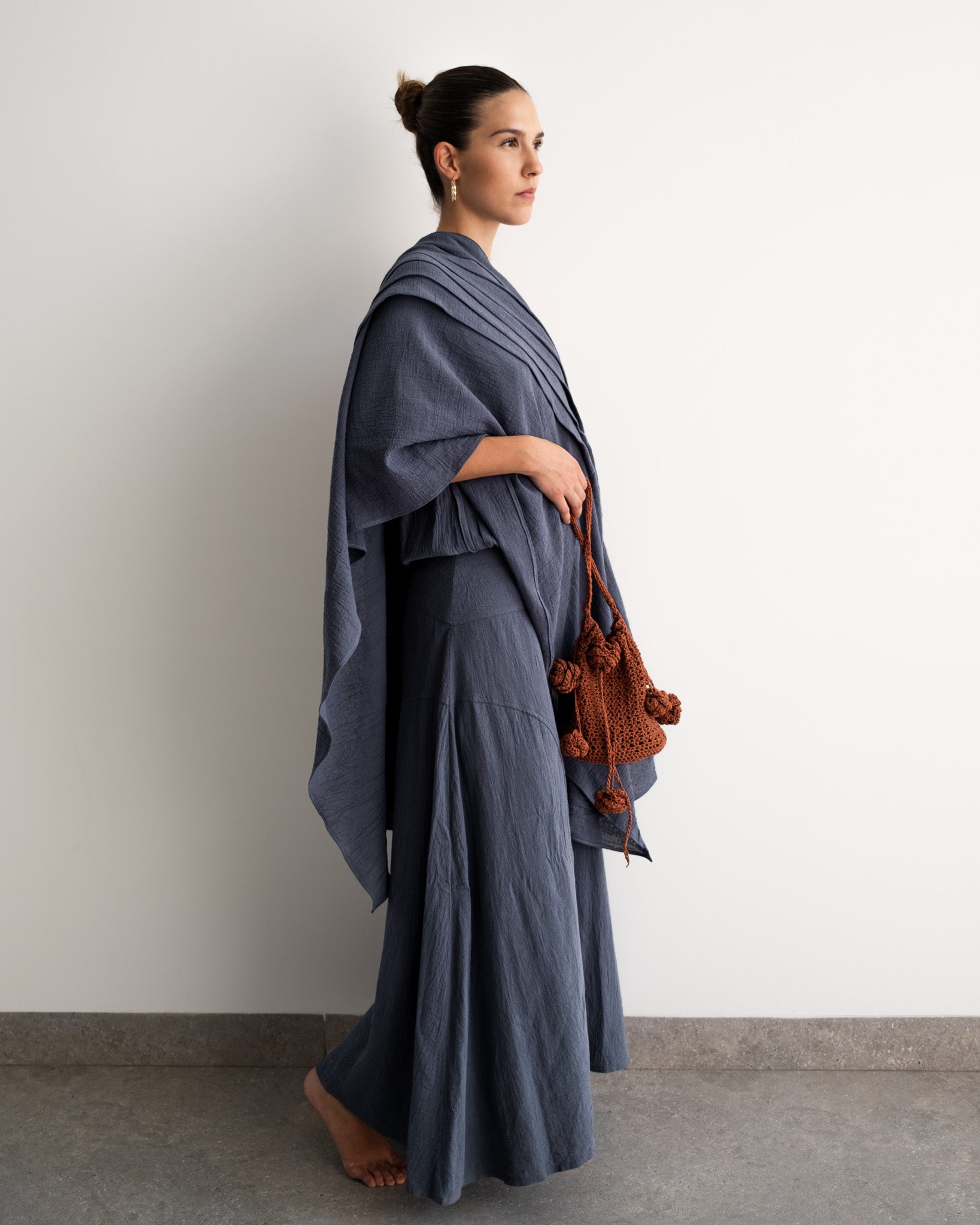It's accompanied by a high-waisted maxi skirt with an elegant curved cut that adds movement and structure to the silhouette. Both pieces are made from 100% cotton fabric , a natural textile that's gentle on your skin and kind to the environment.
